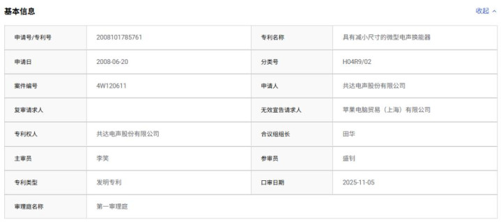 2025年10月10日,国家知识产权局正式公开了一起苹果公司挑战中国电声元器件制造商共达电声专利的无效口审信息,直接印证了共达电声在今年4月的公告中提到的已经起诉的两个神秘被告A和B侵犯其专利的当事方,就是苹果公司。